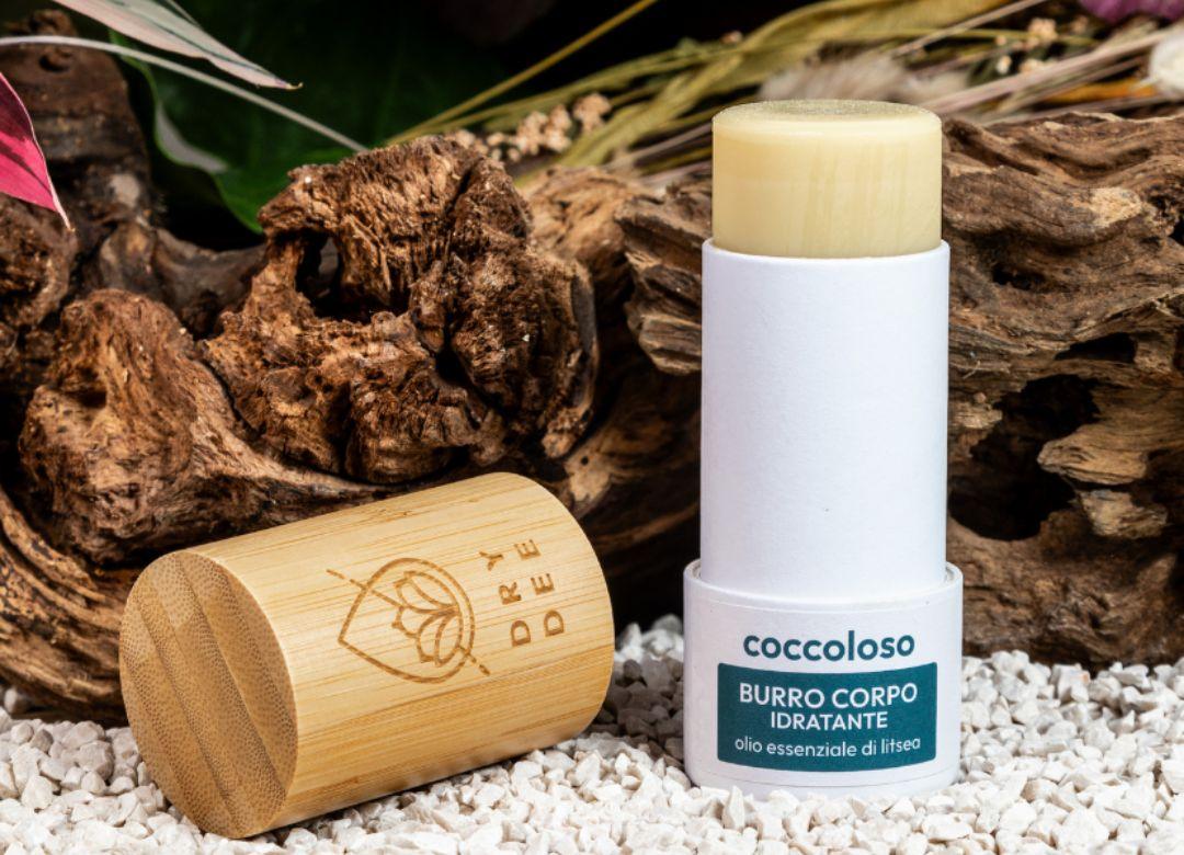 Coccoloso: Theobroma cacao seed butter, Butyrospermum parkii butter, Copernicia cerifera cera, Ricinus communis seed oil, Corylus avellana seed oil, Olea europaea fruit oil, Prunus amygdalus dulcis oil, Euphorbia cerifera cera, Litsea cubeba fruit essential oil, Limonene, Linalool